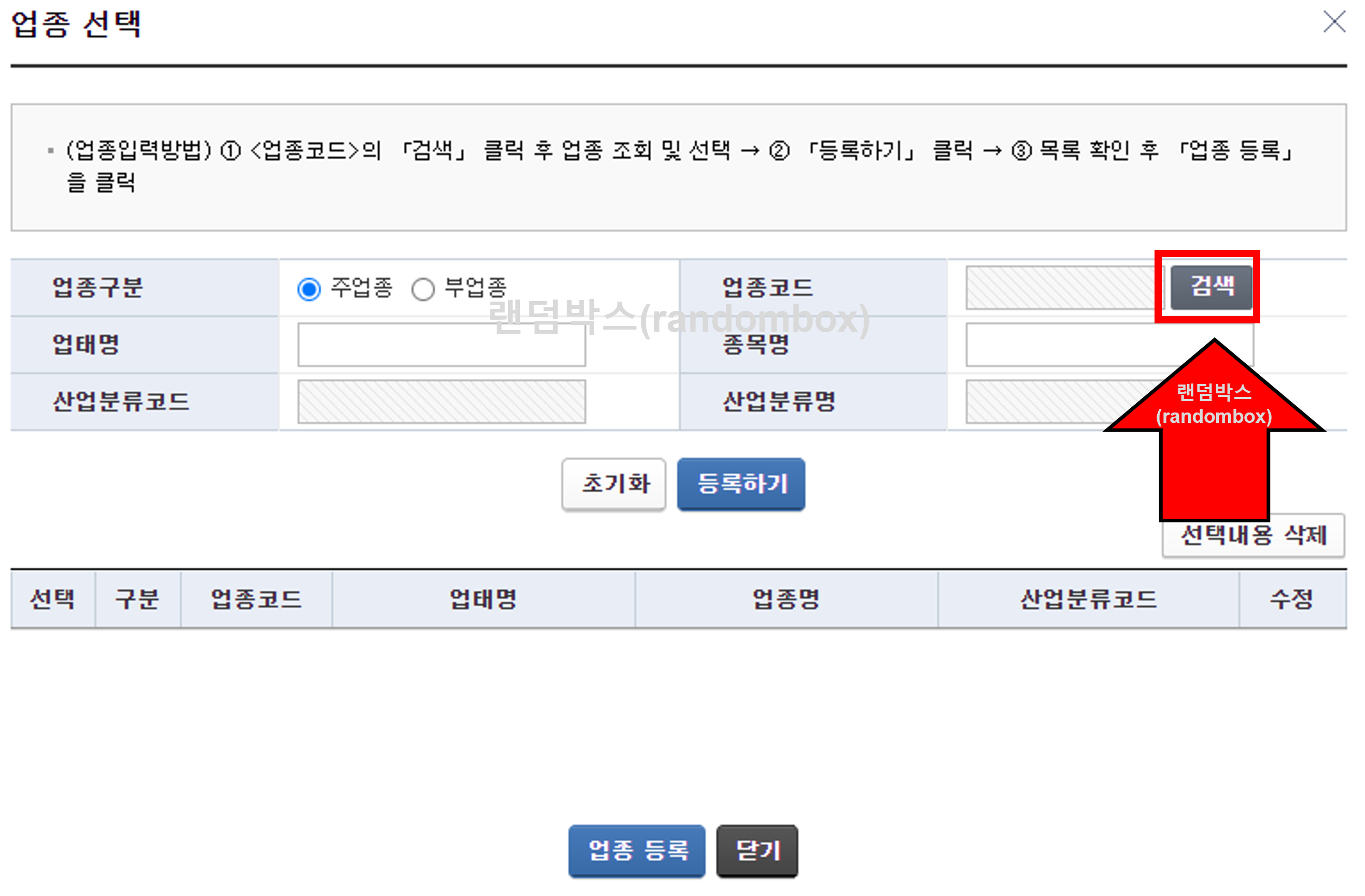 - 업종이 전자상거래[업종코드 525101] 일 경우에만 해당하며, 다른 업종이실 경우 해당하는 업종에 키워드를 입력하여 찾아줍니다.