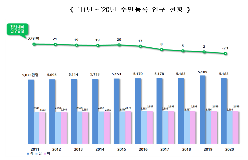 ◇ ’20년末 주민등록 인구는 51,829,023명(전년대비 △0.04%)