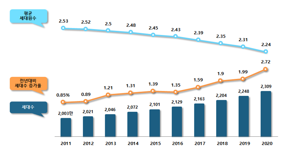 - 평균 세대원수는 2.3명 아래로 떨어져(2.24명)