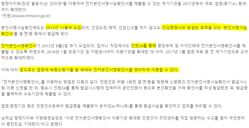 행정안전부에서 보도한 자료에 의하면 앞으로는 민원 24를 통하여 인터넷 발급이 가능하며, 법원 부동산 등기할 때에도 사용할 수 있고, 인감증명서와 동일한 효력을 발휘함을 알 수 있습니다.