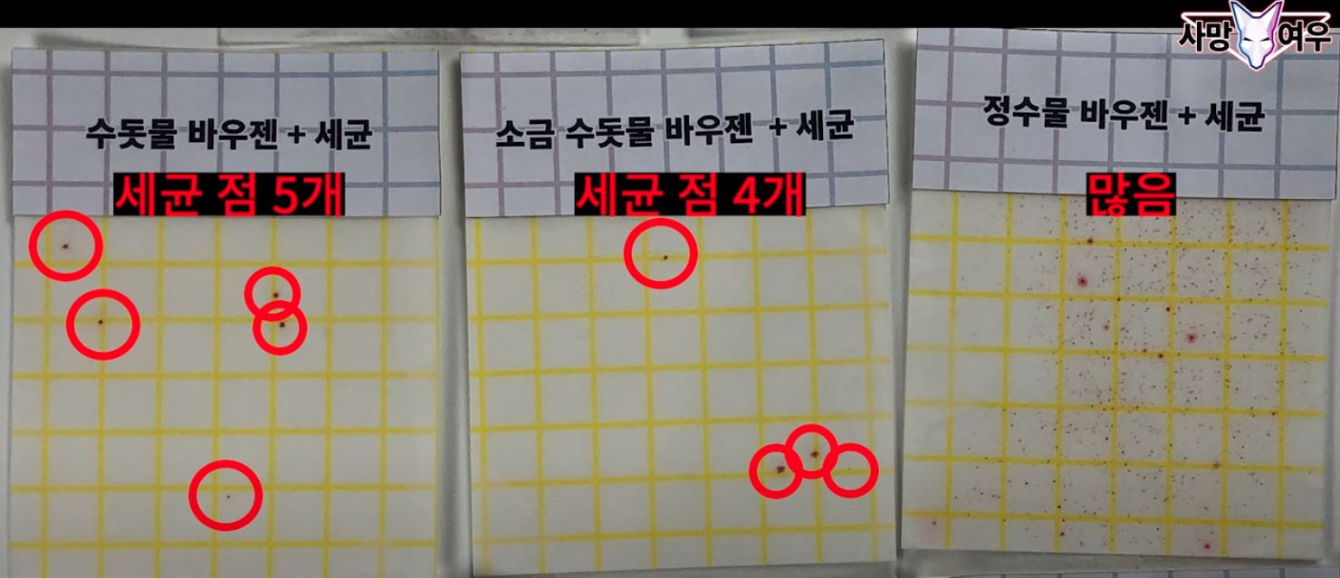 소금 수돗물 바우젠 + 세균 => 세균 점 4개