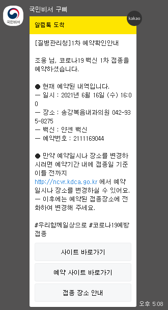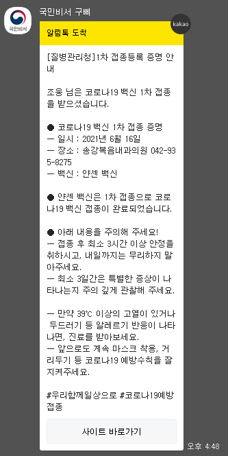 예방 접종을 한 후에는 아래와 같은 카톡이 옵니다.