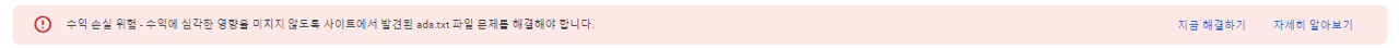 티스토리를 운영해보신 분이라면 알겠지만 어느날 애드센스에 갑자기 위와 같은 팝업이 표시가 됩니다. 아직 수익도 별로 없어서 안그래도 예민한데, 거기에 수익 손실위험이 있다고 표시가 되서 자극이 되죠.