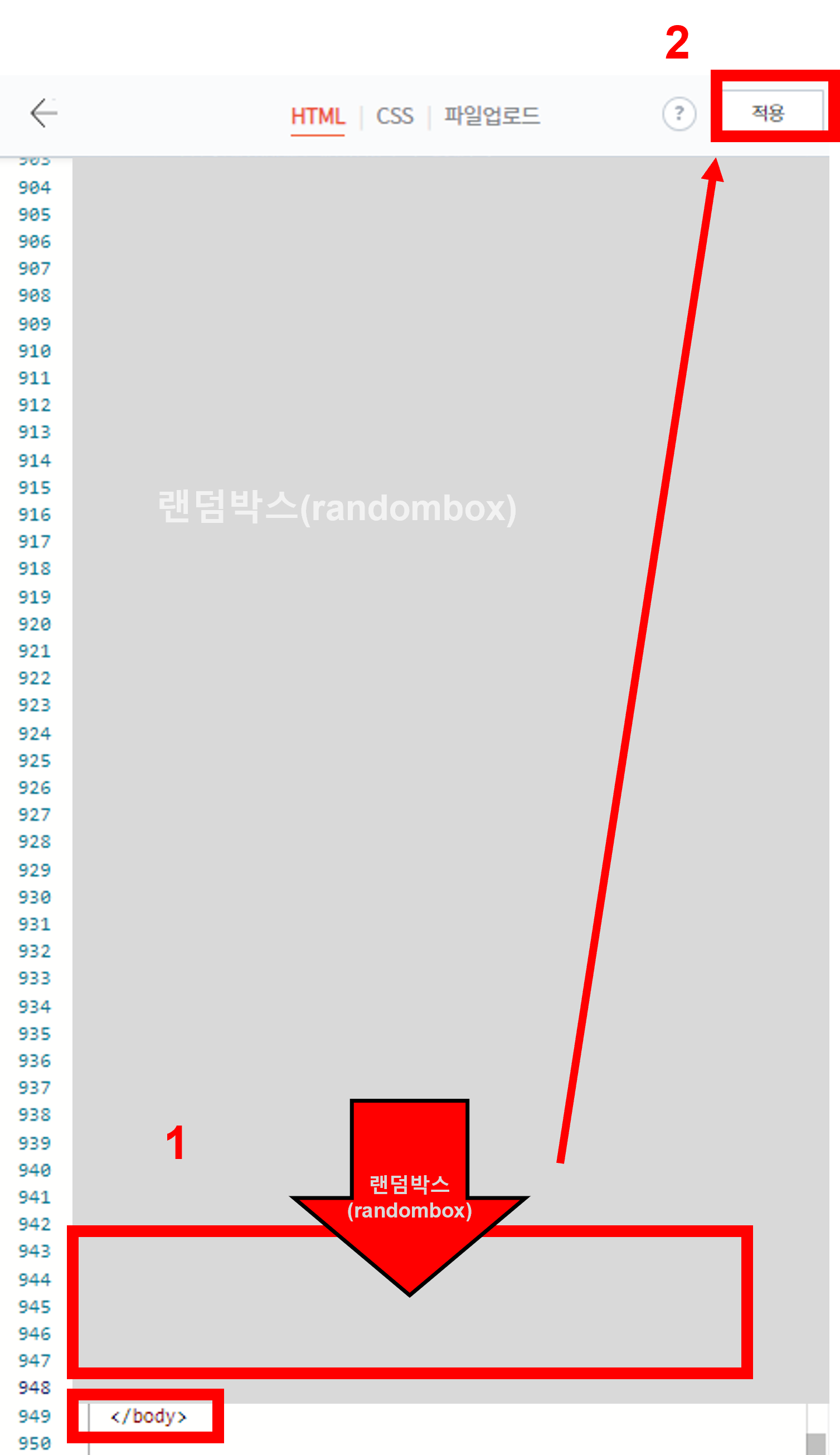 11) /body 위에 복사한 스크립트를 붙여넣은 후에 [적용]을 누릅니다. /body의 정확한 위치는 다를 수 있습니다. 가장 하단 쪽으로 내리시거나 Ctrl+F를 누르셔서 검색하실 수 있습니다.