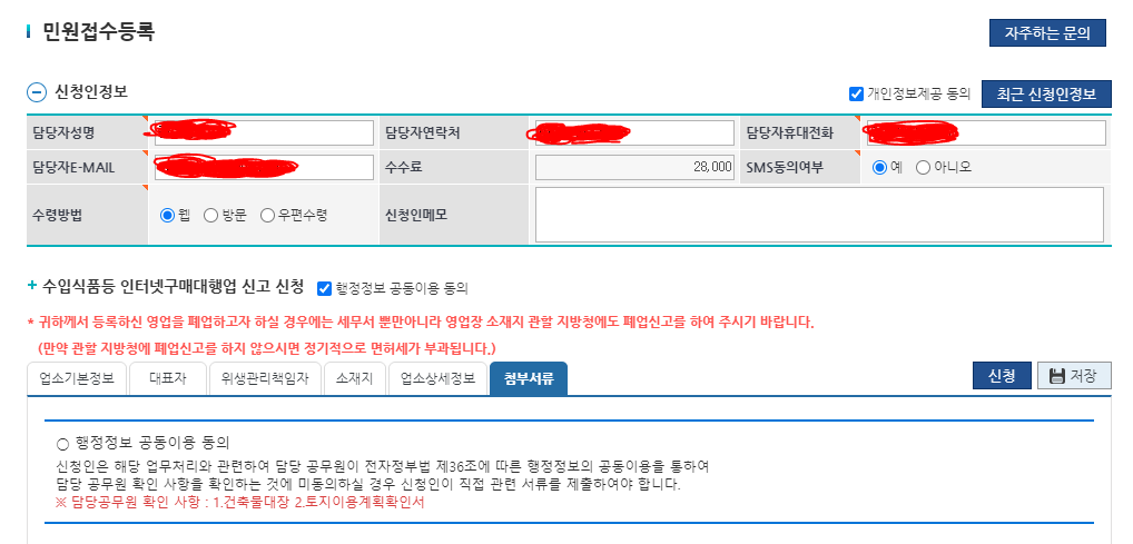 - 작성 필요 : 신청인정보 / 업소기본정보 / 소재지 / 첨부서류 - 개인정보동의서, 교육이수증(한국식품산업협회수료증)