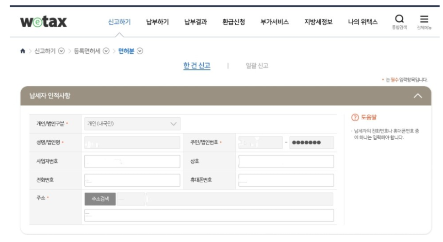 1. [위택스] - [신고하기] - [등록 면허세] - [면허분] 선택 후에 자신의 해당 정보를 기입하면 면허세 납부하라는 내역이 나옵니다.