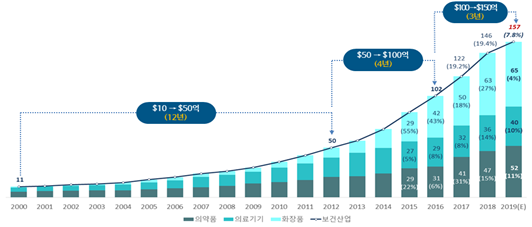 < 보건산업 수출 동향(2000~19년, 억 달러) >
